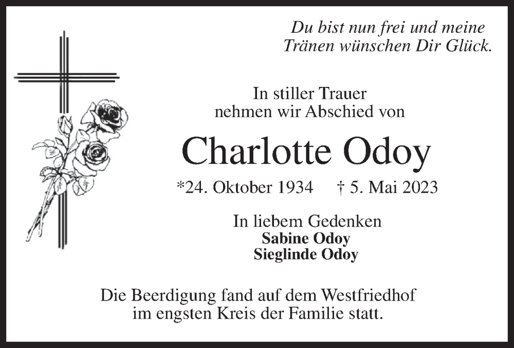 Hier finden Sie alle Traueranzeigen aus der Zeitung, die bisher für Charlotte Odoy erschienen sind. Weitere Traueranzeigen, die in der Zeitung erscheinen, werden hier ebenfalls aufgelistet