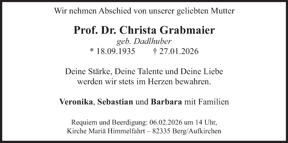 Hier finden Sie alle Traueranzeigen aus der Zeitung, die bisher für Christa Grabmaier erschienen sind. Weitere Traueranzeigen, die in der Zeitung erscheinen, werden hier ebenfalls aufgelistet