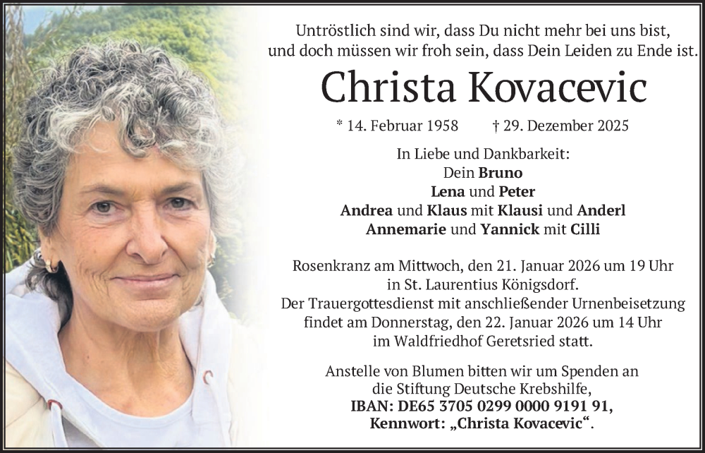 Hier finden Sie alle Traueranzeigen aus der Zeitung, die bisher für Christa Kovacevic erschienen sind. Weitere Traueranzeigen, die in der Zeitung erscheinen, werden hier ebenfalls aufgelistet