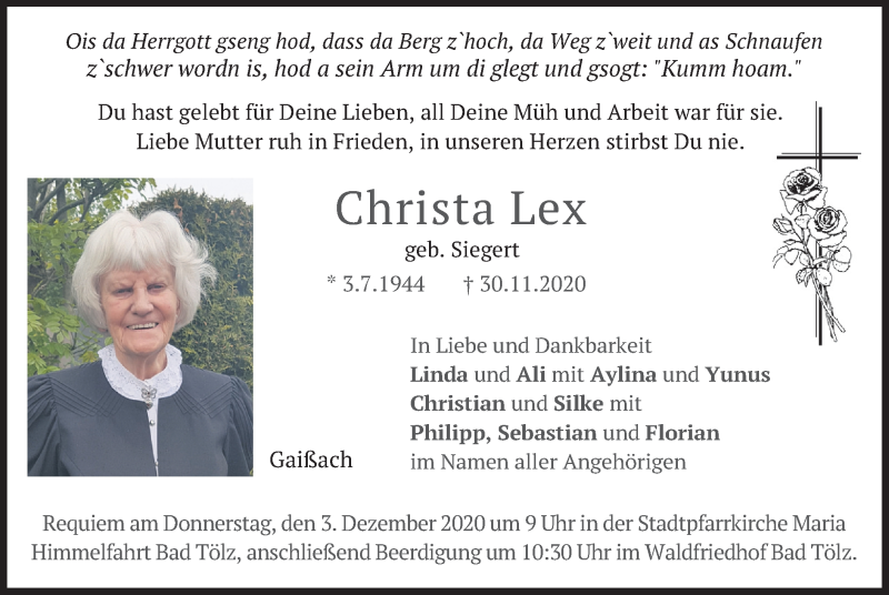 Hier finden Sie alle Traueranzeigen aus der Zeitung, die bisher für Christa Lex erschienen sind. Weitere Traueranzeigen, die in der Zeitung erscheinen, werden hier ebenfalls aufgelistet