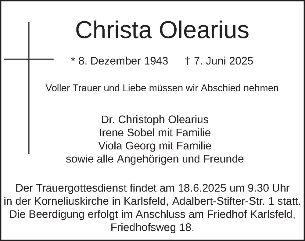 Hier finden Sie alle Traueranzeigen aus der Zeitung, die bisher für Christa Olearius erschienen sind. Weitere Traueranzeigen, die in der Zeitung erscheinen, werden hier ebenfalls aufgelistet
