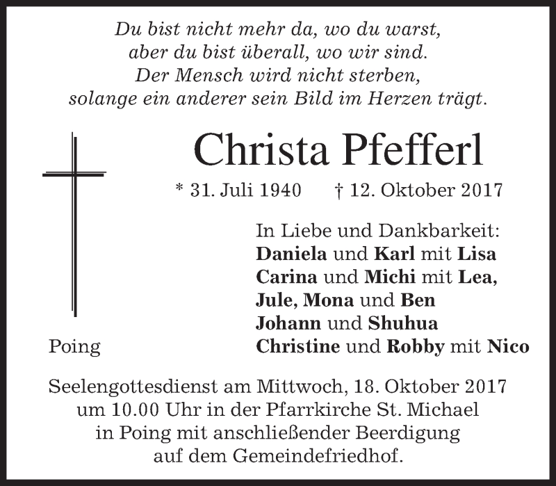Hier finden Sie alle Traueranzeigen aus der Zeitung, die bisher für Christa Pfefferl erschienen sind. Weitere Traueranzeigen, die in der Zeitung erscheinen, werden hier ebenfalls aufgelistet