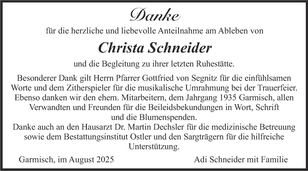 Hier finden Sie alle Traueranzeigen aus der Zeitung, die bisher für Christa Schneider erschienen sind. Weitere Traueranzeigen, die in der Zeitung erscheinen, werden hier ebenfalls aufgelistet