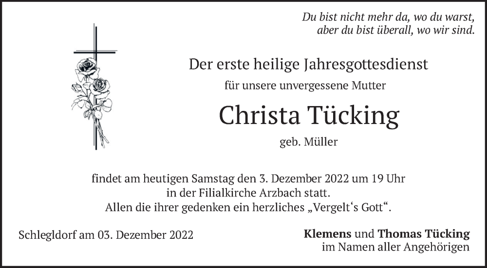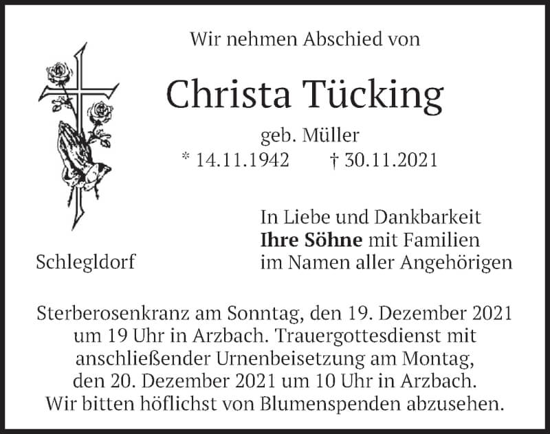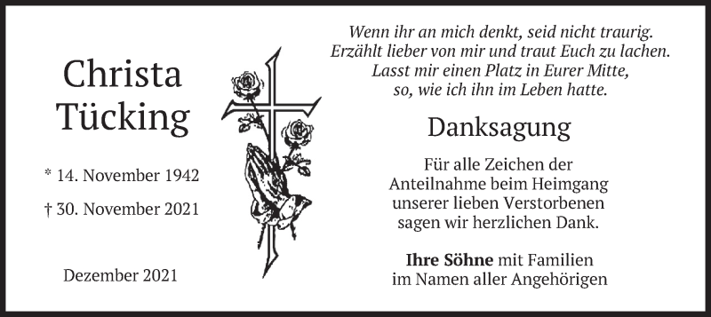 Hier finden Sie alle Traueranzeigen aus der Zeitung, die bisher für Christa Tücking erschienen sind. Weitere Traueranzeigen, die in der Zeitung erscheinen, werden hier ebenfalls aufgelistet
