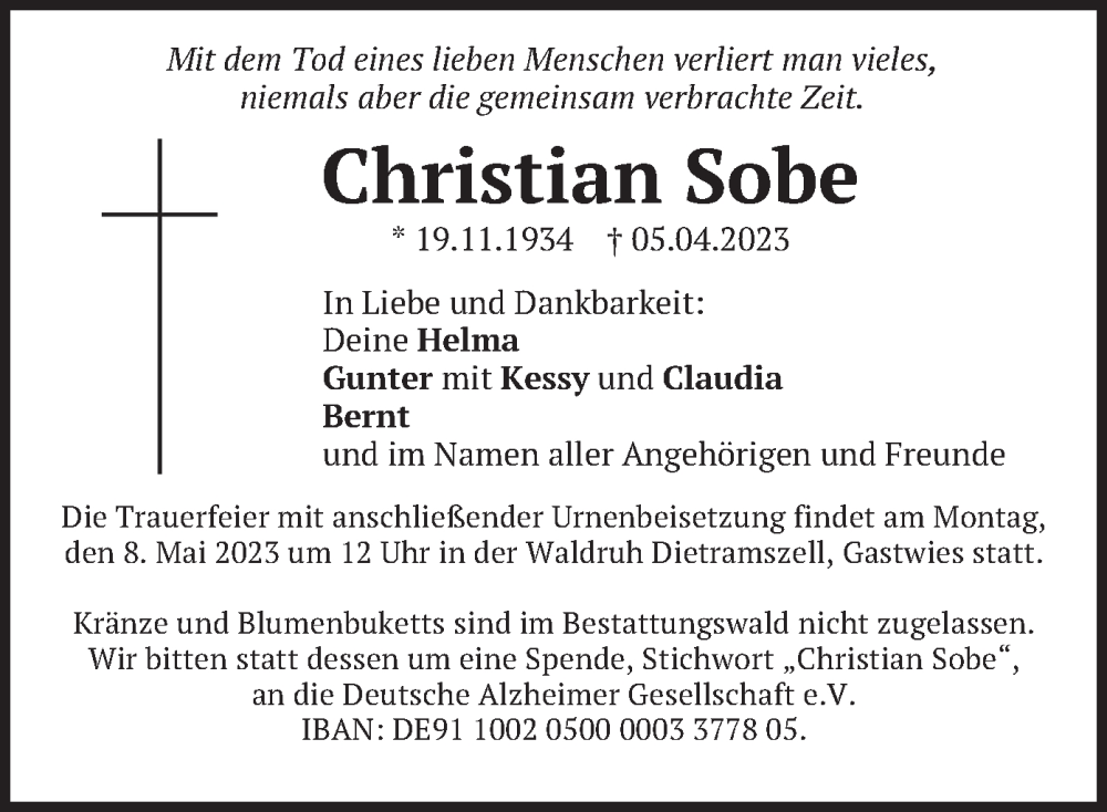 Hier finden Sie alle Traueranzeigen aus der Zeitung, die bisher für Christian Sobe erschienen sind. Weitere Traueranzeigen, die in der Zeitung erscheinen, werden hier ebenfalls aufgelistet