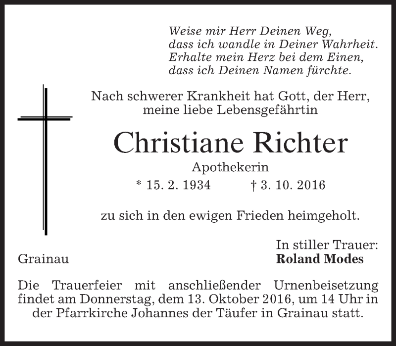 Hier finden Sie alle Traueranzeigen aus der Zeitung, die bisher für Christiane Richter erschienen sind. Weitere Traueranzeigen, die in der Zeitung erscheinen, werden hier ebenfalls aufgelistet