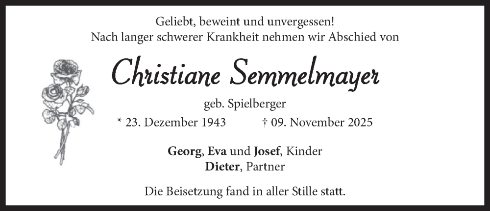 Hier finden Sie alle Traueranzeigen aus der Zeitung, die bisher für Christiane Semmelmayer erschienen sind. Weitere Traueranzeigen, die in der Zeitung erscheinen, werden hier ebenfalls aufgelistet