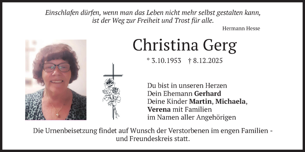 Hier finden Sie alle Traueranzeigen aus der Zeitung, die bisher für Christina Gerg erschienen sind. Weitere Traueranzeigen, die in der Zeitung erscheinen, werden hier ebenfalls aufgelistet