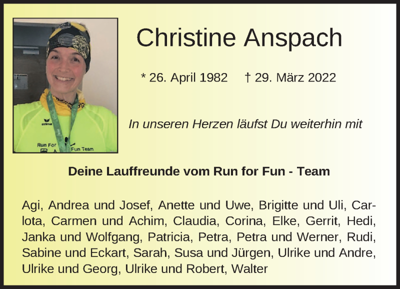 Hier finden Sie alle Traueranzeigen aus der Zeitung, die bisher für Christine Anspach erschienen sind. Weitere Traueranzeigen, die in der Zeitung erscheinen, werden hier ebenfalls aufgelistet