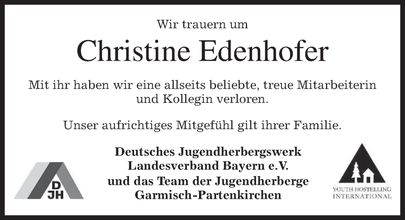 Hier finden Sie alle Traueranzeigen aus der Zeitung, die bisher für Christine Edenhofer erschienen sind. Weitere Traueranzeigen, die in der Zeitung erscheinen, werden hier ebenfalls aufgelistet