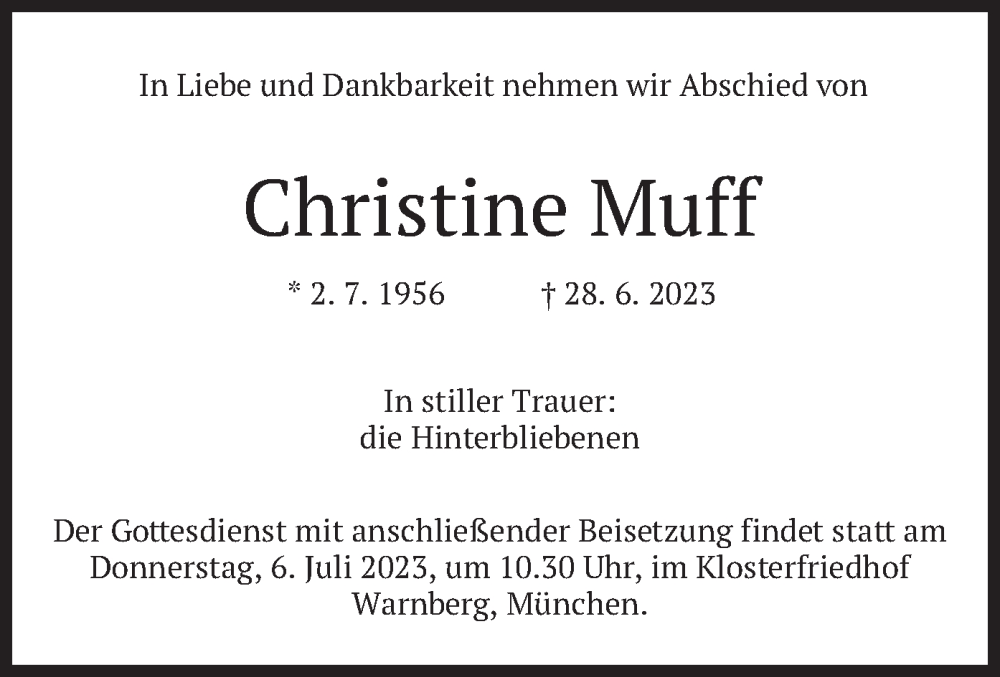 Hier finden Sie alle Traueranzeigen aus der Zeitung, die bisher für Christine Muff erschienen sind. Weitere Traueranzeigen, die in der Zeitung erscheinen, werden hier ebenfalls aufgelistet
