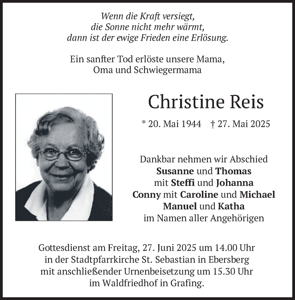 Hier finden Sie alle Traueranzeigen aus der Zeitung, die bisher für Christine Reis erschienen sind. Weitere Traueranzeigen, die in der Zeitung erscheinen, werden hier ebenfalls aufgelistet