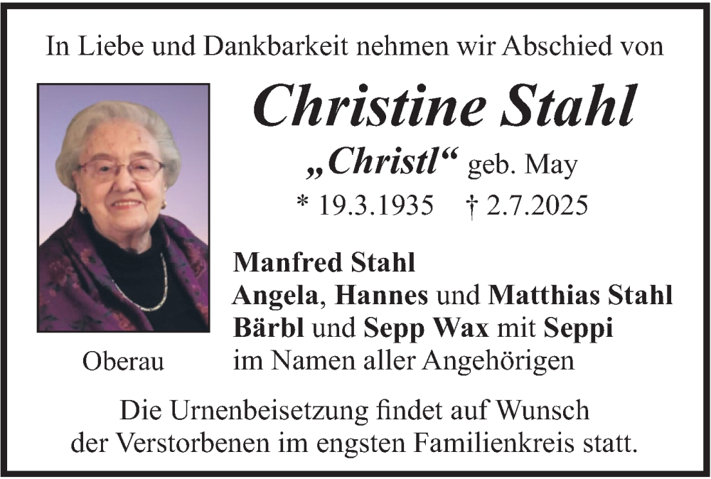 Hier finden Sie alle Traueranzeigen aus der Zeitung, die bisher für Christine Stahl erschienen sind. Weitere Traueranzeigen, die in der Zeitung erscheinen, werden hier ebenfalls aufgelistet