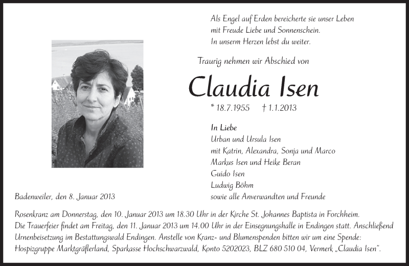 Hier finden Sie alle Traueranzeigen aus der Zeitung, die bisher für Claudia Isen erschienen sind. Weitere Traueranzeigen, die in der Zeitung erscheinen, werden hier ebenfalls aufgelistet