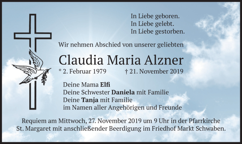 Hier finden Sie alle Traueranzeigen aus der Zeitung, die bisher für Claudia Maria Alzner erschienen sind. Weitere Traueranzeigen, die in der Zeitung erscheinen, werden hier ebenfalls aufgelistet