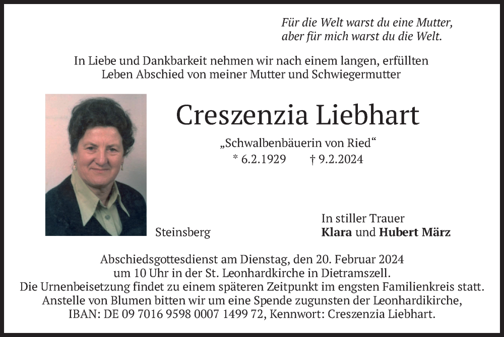 Hier finden Sie alle Traueranzeigen aus der Zeitung, die bisher für Creszenzia Liebhart erschienen sind. Weitere Traueranzeigen, die in der Zeitung erscheinen, werden hier ebenfalls aufgelistet