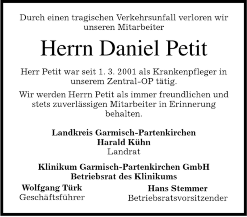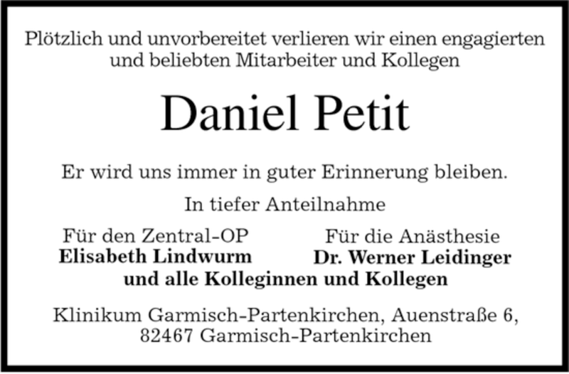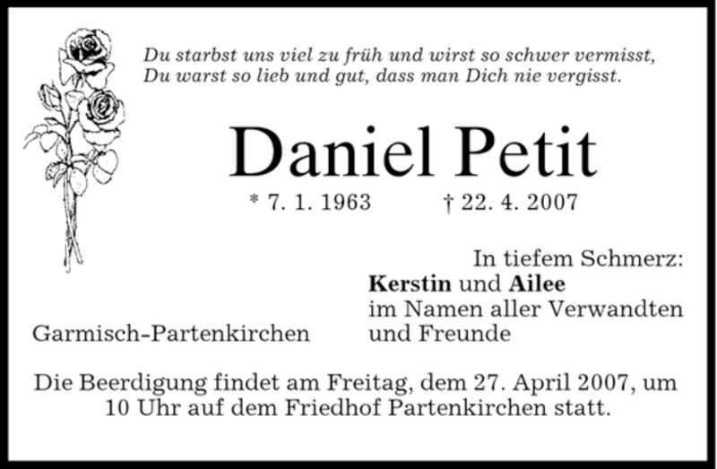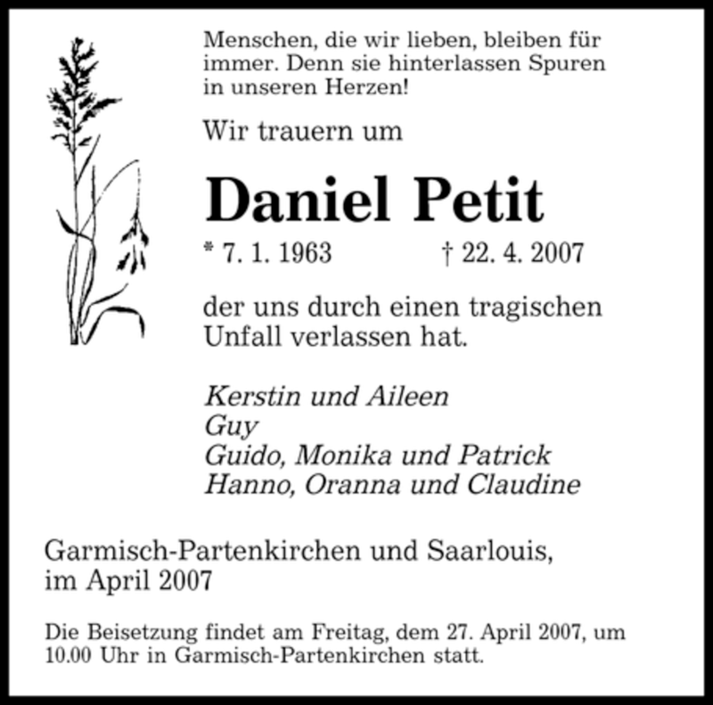 Hier finden Sie alle Traueranzeigen aus der Zeitung, die bisher für Daniel Petit erschienen sind. Weitere Traueranzeigen, die in der Zeitung erscheinen, werden hier ebenfalls aufgelistet
