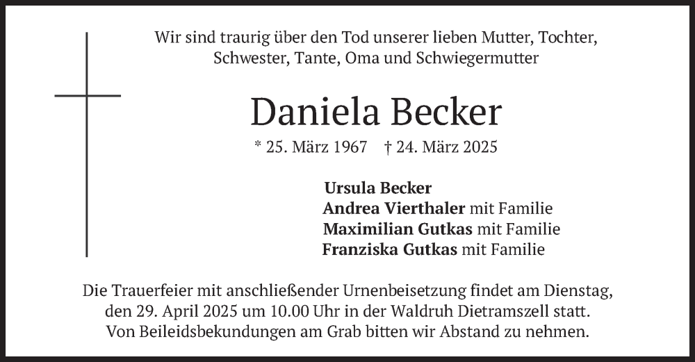 Hier finden Sie alle Traueranzeigen aus der Zeitung, die bisher für Daniela Becker erschienen sind. Weitere Traueranzeigen, die in der Zeitung erscheinen, werden hier ebenfalls aufgelistet