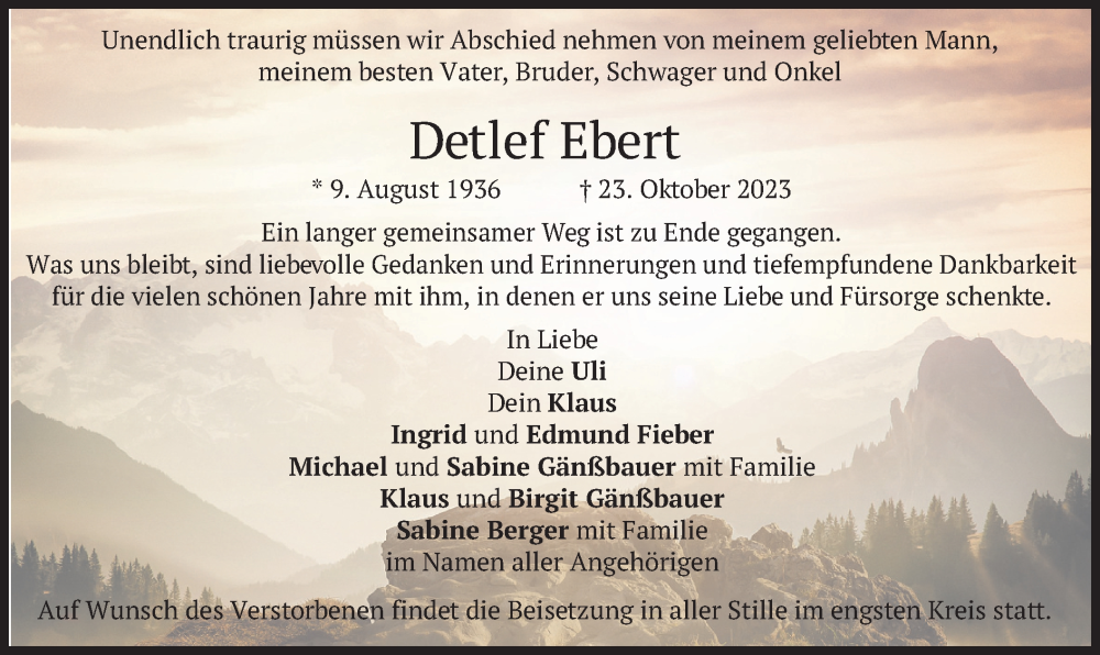 Hier finden Sie alle Traueranzeigen aus der Zeitung, die bisher für Detlef Ebert erschienen sind. Weitere Traueranzeigen, die in der Zeitung erscheinen, werden hier ebenfalls aufgelistet