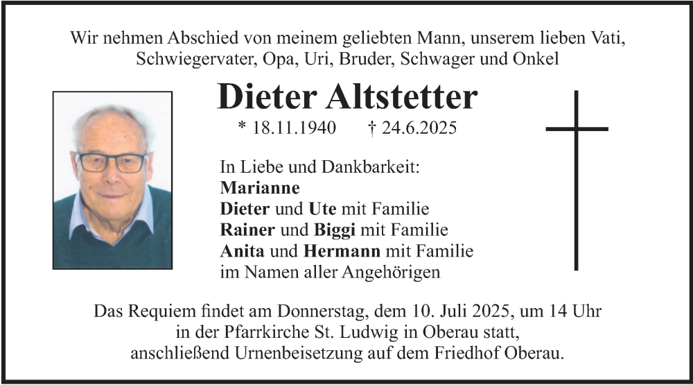 Hier finden Sie alle Traueranzeigen aus der Zeitung, die bisher für Dieter Altstetter erschienen sind. Weitere Traueranzeigen, die in der Zeitung erscheinen, werden hier ebenfalls aufgelistet