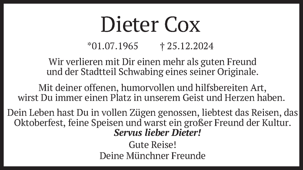Hier finden Sie alle Traueranzeigen aus der Zeitung, die bisher für Dieter Cox erschienen sind. Weitere Traueranzeigen, die in der Zeitung erscheinen, werden hier ebenfalls aufgelistet