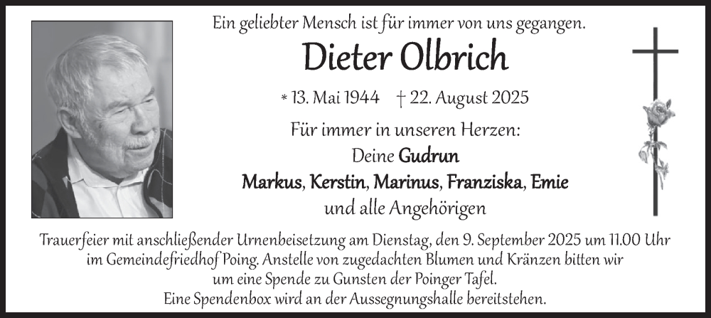 Hier finden Sie alle Traueranzeigen aus der Zeitung, die bisher für Dieter Olbrich erschienen sind. Weitere Traueranzeigen, die in der Zeitung erscheinen, werden hier ebenfalls aufgelistet