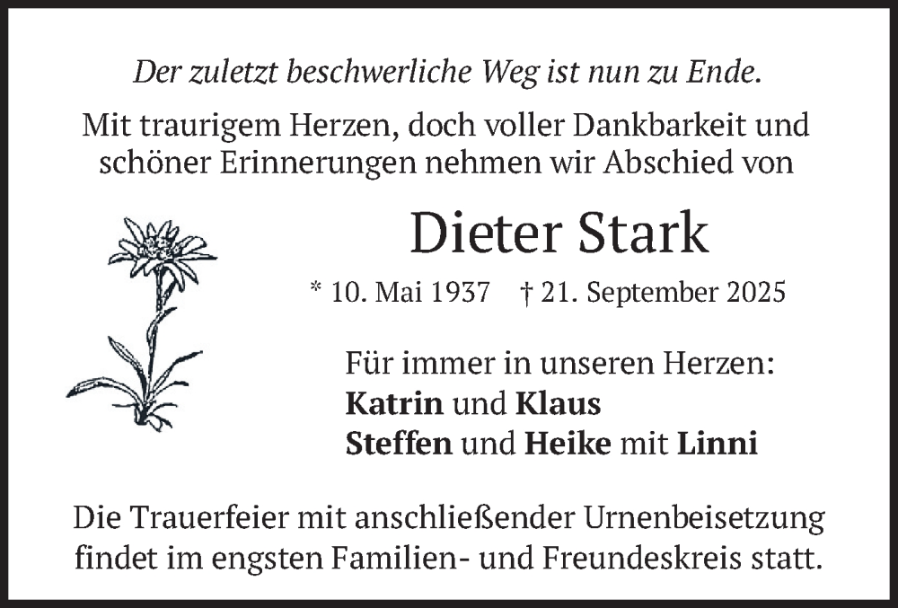Hier finden Sie alle Traueranzeigen aus der Zeitung, die bisher für Dieter Stark erschienen sind. Weitere Traueranzeigen, die in der Zeitung erscheinen, werden hier ebenfalls aufgelistet