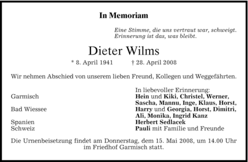 Hier finden Sie alle Traueranzeigen aus der Zeitung, die bisher für Dieter Wilms erschienen sind. Weitere Traueranzeigen, die in der Zeitung erscheinen, werden hier ebenfalls aufgelistet