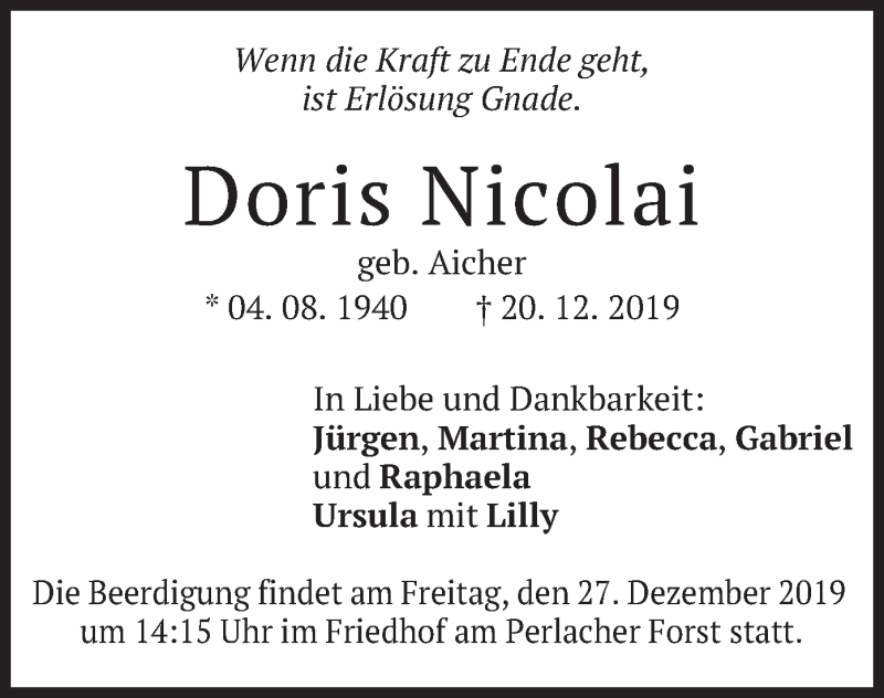 Hier finden Sie alle Traueranzeigen aus der Zeitung, die bisher für Doris Nicolai erschienen sind. Weitere Traueranzeigen, die in der Zeitung erscheinen, werden hier ebenfalls aufgelistet