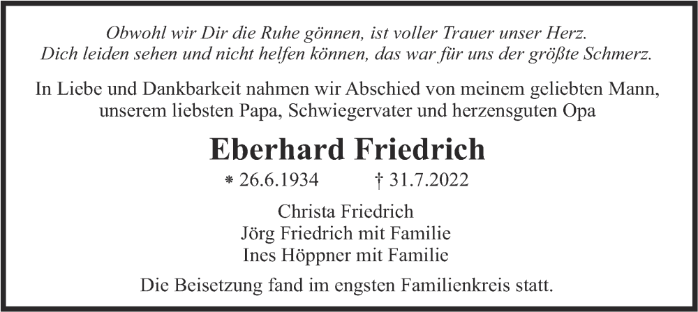 Hier finden Sie alle Traueranzeigen aus der Zeitung, die bisher für Eberhard Friedrich erschienen sind. Weitere Traueranzeigen, die in der Zeitung erscheinen, werden hier ebenfalls aufgelistet