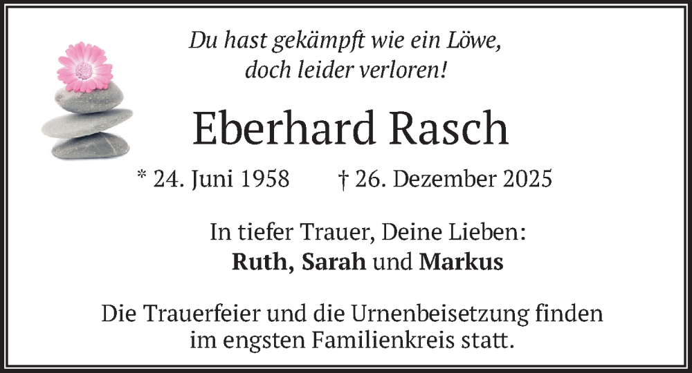 Hier finden Sie alle Traueranzeigen aus der Zeitung, die bisher für Eberhard Rasch erschienen sind. Weitere Traueranzeigen, die in der Zeitung erscheinen, werden hier ebenfalls aufgelistet