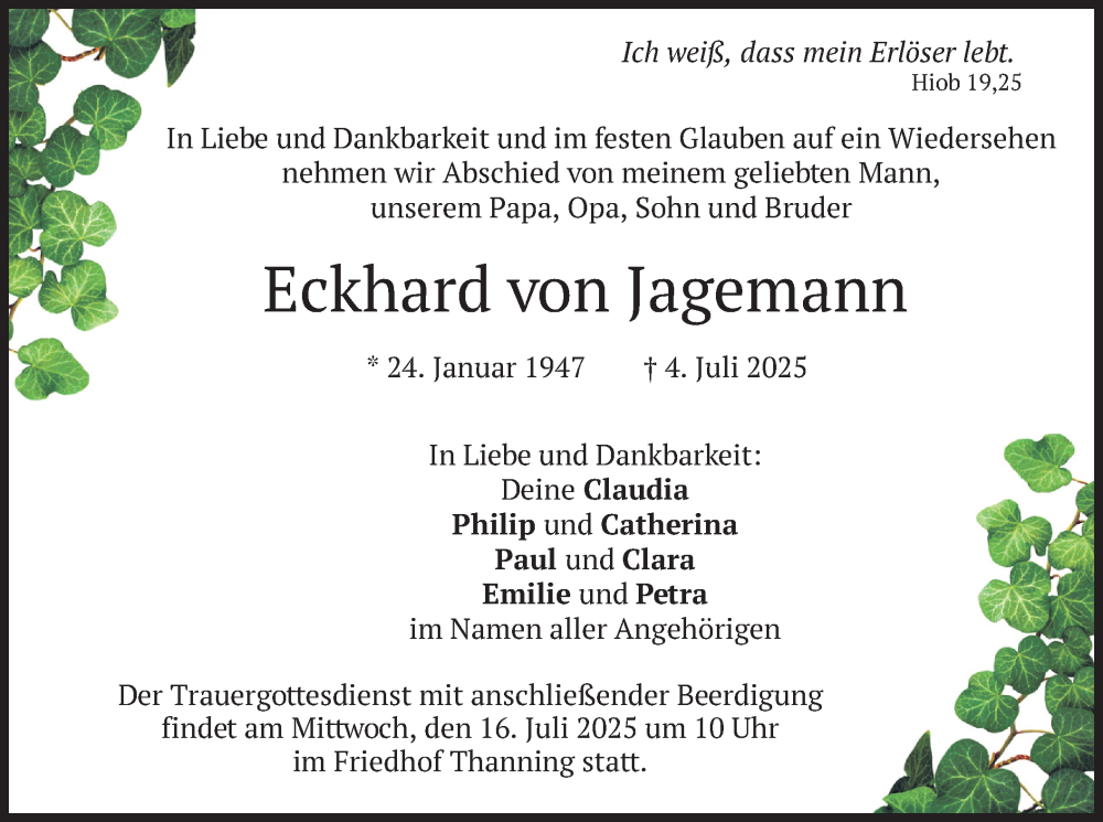 Hier finden Sie alle Traueranzeigen aus der Zeitung, die bisher für Eckhard von Jagemann erschienen sind. Weitere Traueranzeigen, die in der Zeitung erscheinen, werden hier ebenfalls aufgelistet