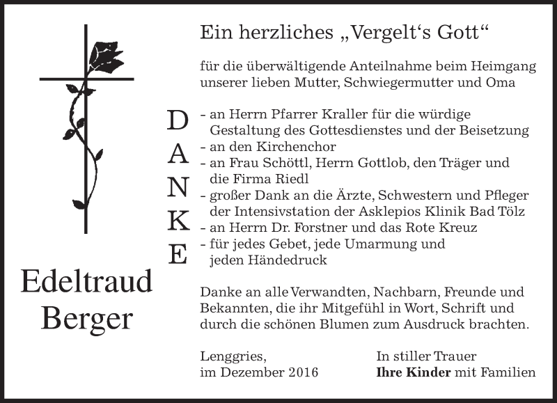 Hier finden Sie alle Traueranzeigen aus der Zeitung, die bisher für Edeltraud Berger erschienen sind. Weitere Traueranzeigen, die in der Zeitung erscheinen, werden hier ebenfalls aufgelistet