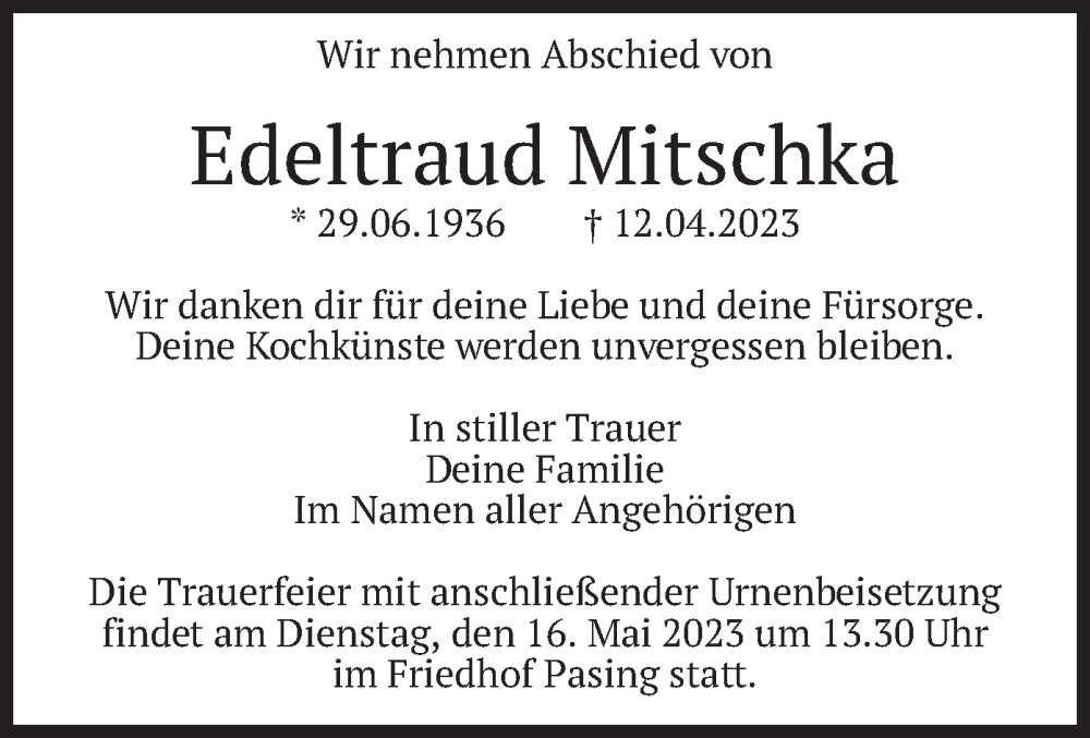 Hier finden Sie alle Traueranzeigen aus der Zeitung, die bisher für Edeltraud Mitschka erschienen sind. Weitere Traueranzeigen, die in der Zeitung erscheinen, werden hier ebenfalls aufgelistet