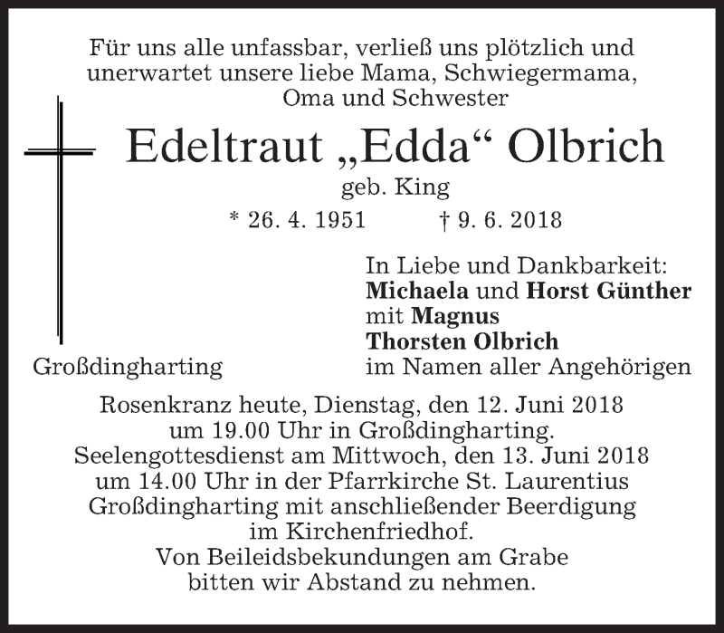 Hier finden Sie alle Traueranzeigen aus der Zeitung, die bisher für Edeltraud Olbrich erschienen sind. Weitere Traueranzeigen, die in der Zeitung erscheinen, werden hier ebenfalls aufgelistet