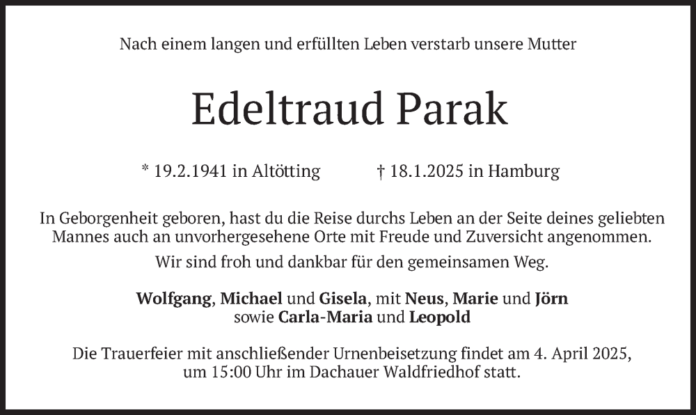 Hier finden Sie alle Traueranzeigen aus der Zeitung, die bisher für Edeltraud Parak erschienen sind. Weitere Traueranzeigen, die in der Zeitung erscheinen, werden hier ebenfalls aufgelistet