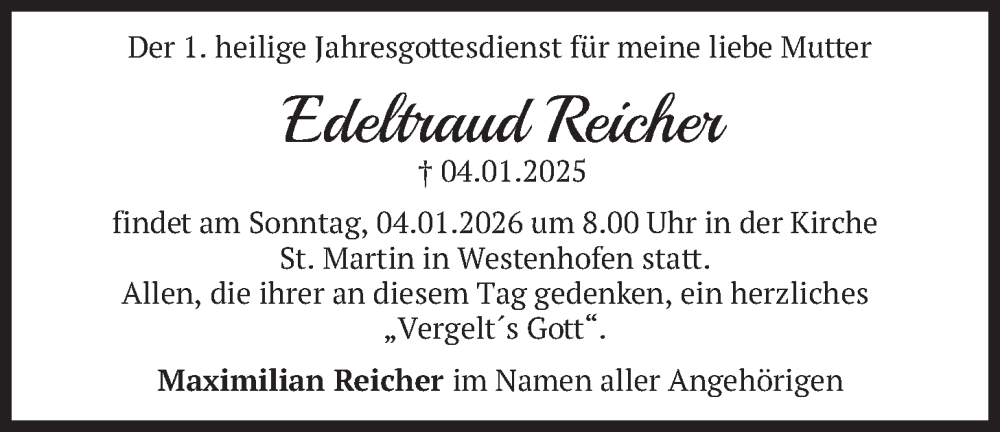 Hier finden Sie alle Traueranzeigen aus der Zeitung, die bisher für Edeltraud Reicher erschienen sind. Weitere Traueranzeigen, die in der Zeitung erscheinen, werden hier ebenfalls aufgelistet