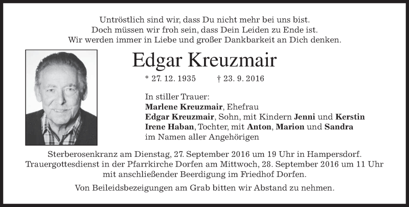 Hier finden Sie alle Traueranzeigen aus der Zeitung, die bisher für Edgar Kreuzmair erschienen sind. Weitere Traueranzeigen, die in der Zeitung erscheinen, werden hier ebenfalls aufgelistet