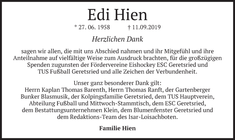 Hier finden Sie alle Traueranzeigen aus der Zeitung, die bisher für Edi Hien erschienen sind. Weitere Traueranzeigen, die in der Zeitung erscheinen, werden hier ebenfalls aufgelistet