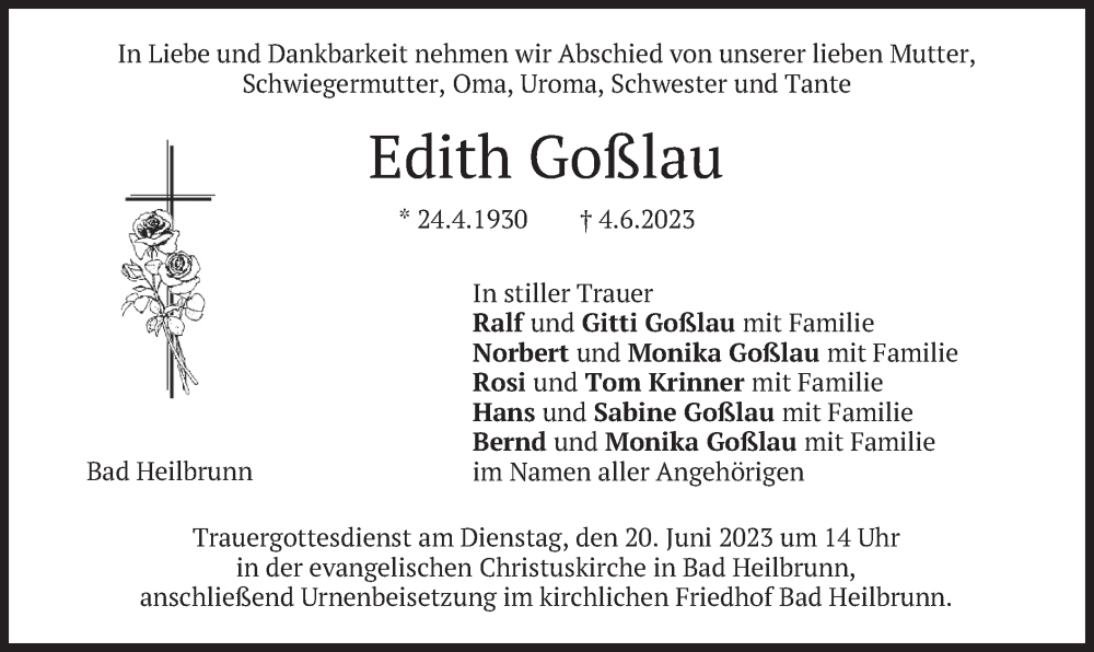 Hier finden Sie alle Traueranzeigen aus der Zeitung, die bisher für Edith Goßlau erschienen sind. Weitere Traueranzeigen, die in der Zeitung erscheinen, werden hier ebenfalls aufgelistet