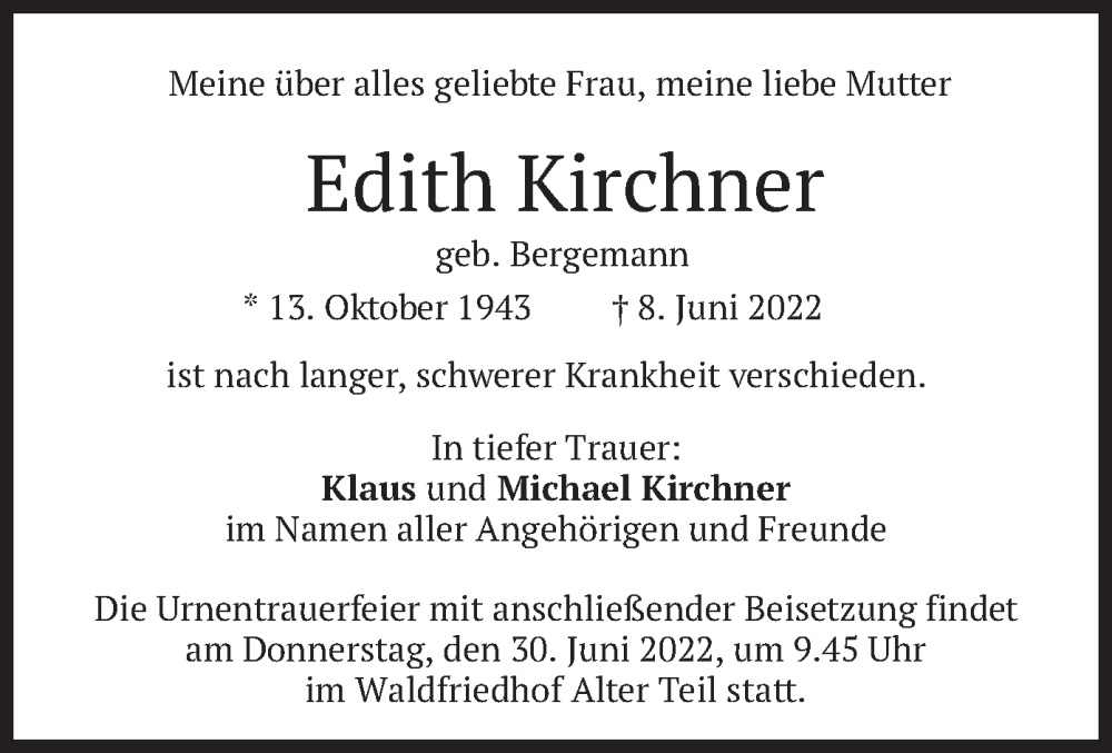 Hier finden Sie alle Traueranzeigen aus der Zeitung, die bisher für Edith Kirchner erschienen sind. Weitere Traueranzeigen, die in der Zeitung erscheinen, werden hier ebenfalls aufgelistet