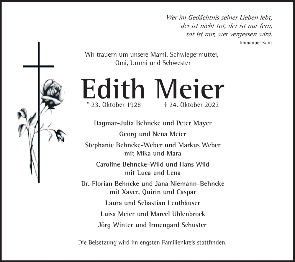Hier finden Sie alle Traueranzeigen aus der Zeitung, die bisher für Edith Meier erschienen sind. Weitere Traueranzeigen, die in der Zeitung erscheinen, werden hier ebenfalls aufgelistet