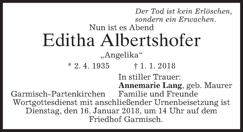 Hier finden Sie alle Traueranzeigen aus der Zeitung, die bisher für Editha Albertshofer erschienen sind. Weitere Traueranzeigen, die in der Zeitung erscheinen, werden hier ebenfalls aufgelistet