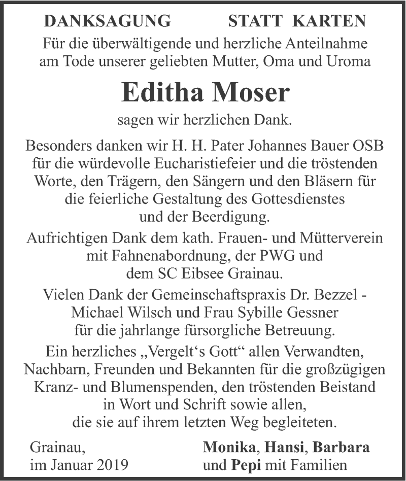 Hier finden Sie alle Traueranzeigen aus der Zeitung, die bisher für Editha Moser erschienen sind. Weitere Traueranzeigen, die in der Zeitung erscheinen, werden hier ebenfalls aufgelistet