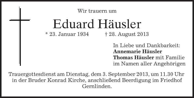 Hier finden Sie alle Traueranzeigen aus der Zeitung, die bisher für Eduard Häusler erschienen sind. Weitere Traueranzeigen, die in der Zeitung erscheinen, werden hier ebenfalls aufgelistet