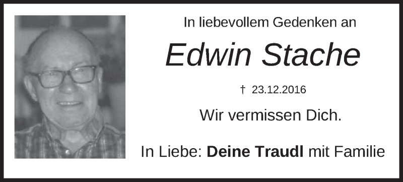 Hier finden Sie alle Traueranzeigen aus der Zeitung, die bisher für Edwin Stache erschienen sind. Weitere Traueranzeigen, die in der Zeitung erscheinen, werden hier ebenfalls aufgelistet