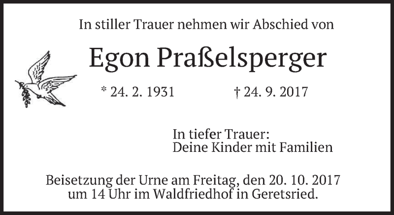 Hier finden Sie alle Traueranzeigen aus der Zeitung, die bisher für Egon Praßelsperger erschienen sind. Weitere Traueranzeigen, die in der Zeitung erscheinen, werden hier ebenfalls aufgelistet