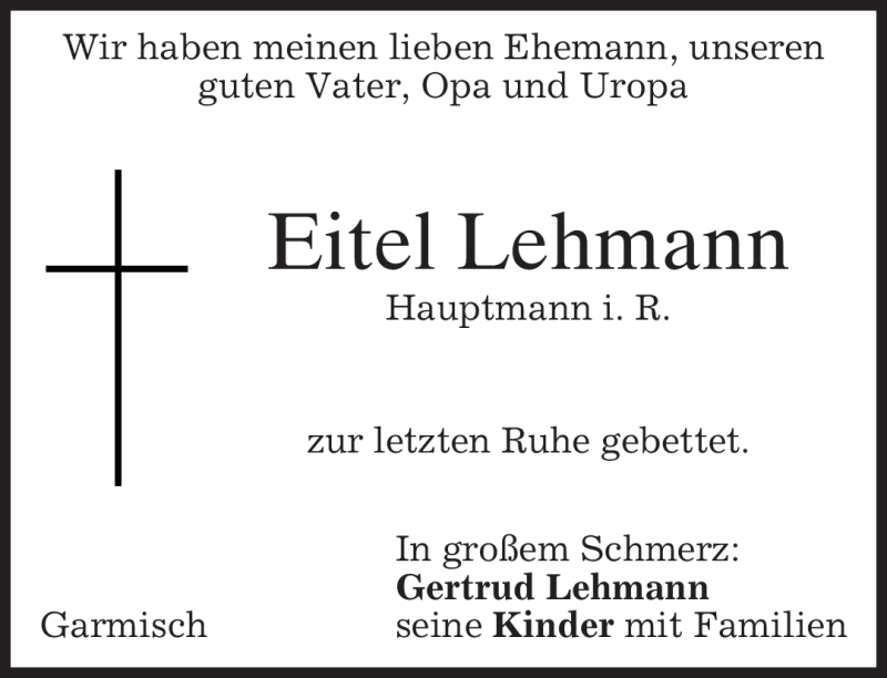 Hier finden Sie alle Traueranzeigen aus der Zeitung, die bisher für Eitel Lehmann erschienen sind. Weitere Traueranzeigen, die in der Zeitung erscheinen, werden hier ebenfalls aufgelistet
