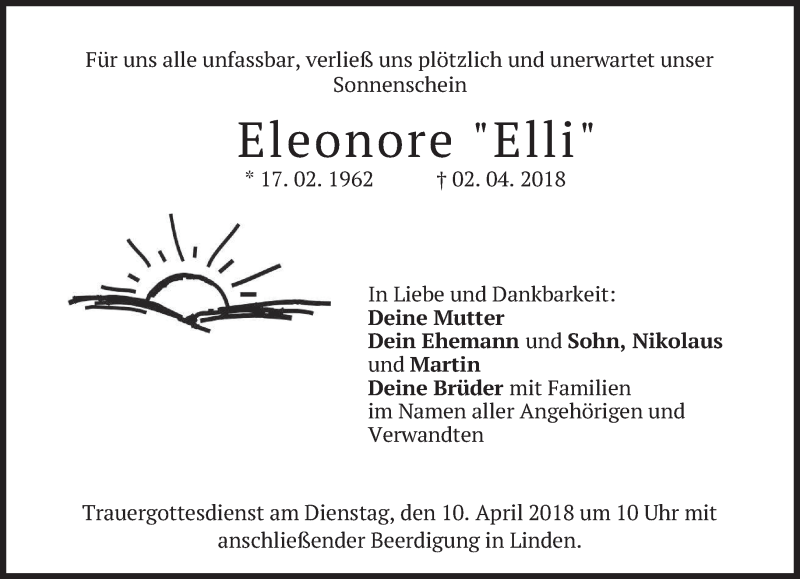 Hier finden Sie alle Traueranzeigen aus der Zeitung, die bisher für Eleonore erschienen sind. Weitere Traueranzeigen, die in der Zeitung erscheinen, werden hier ebenfalls aufgelistet