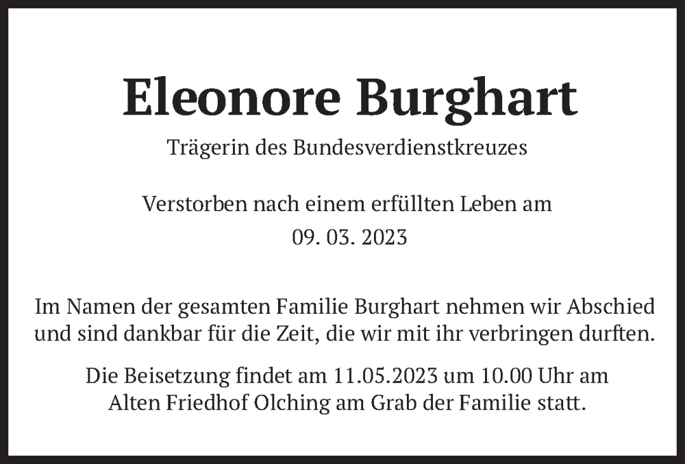 Hier finden Sie alle Traueranzeigen aus der Zeitung, die bisher für Eleonore Burghart erschienen sind. Weitere Traueranzeigen, die in der Zeitung erscheinen, werden hier ebenfalls aufgelistet